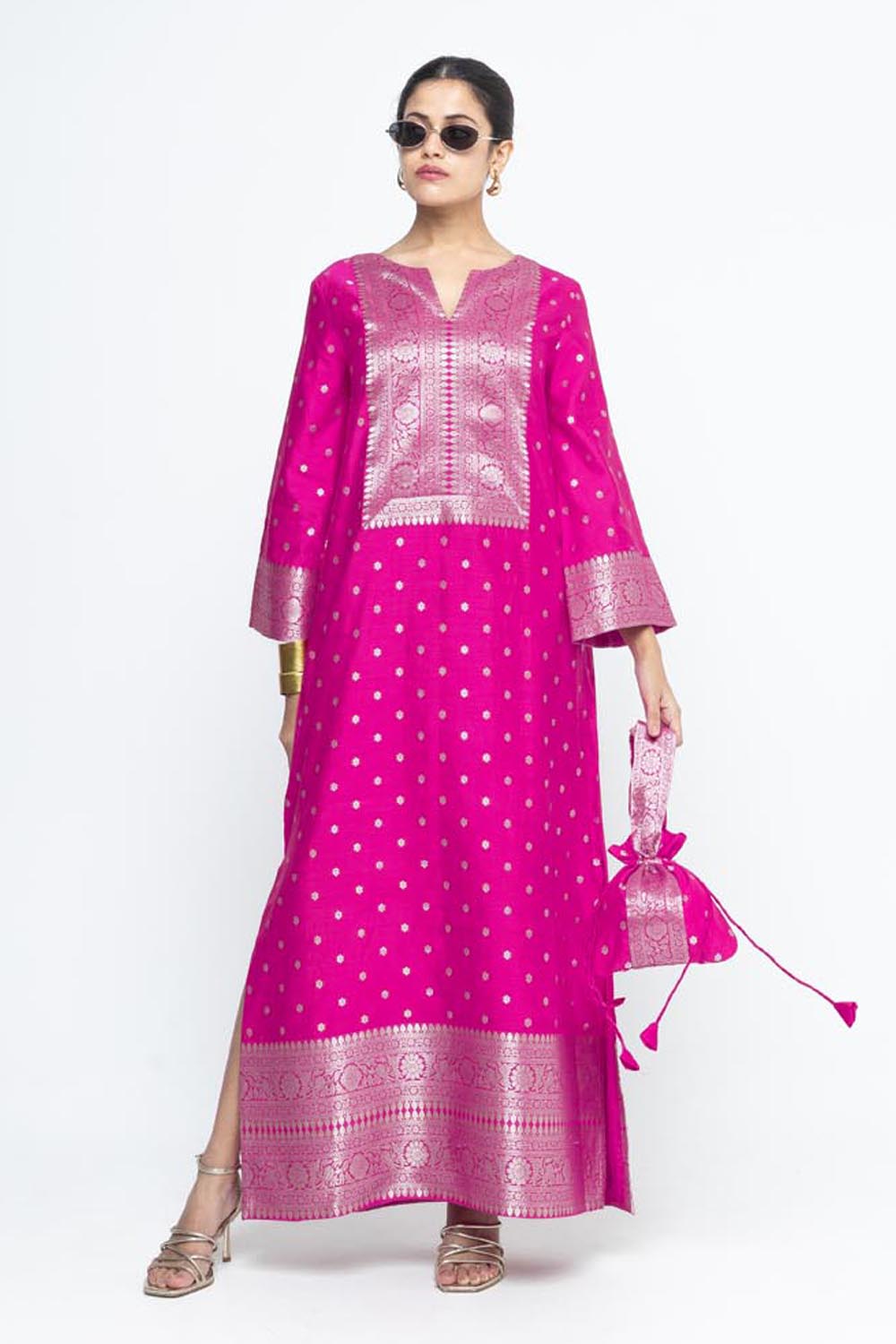 Nats Statement Silk Kaftan With Brocade Detail - Pink